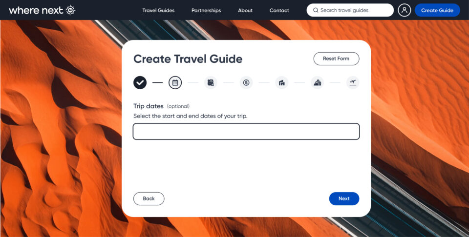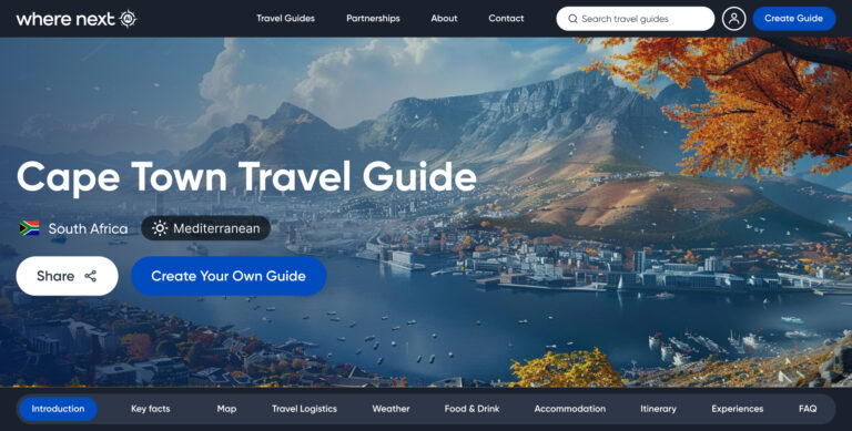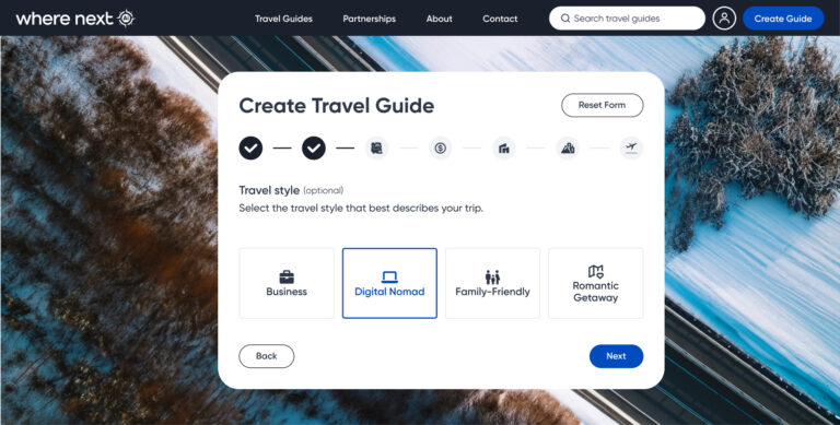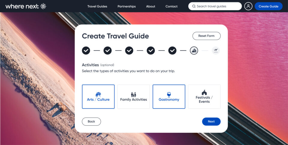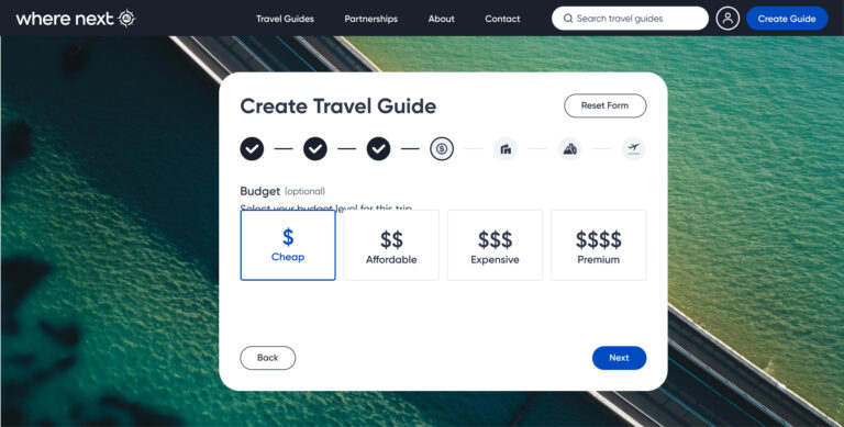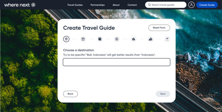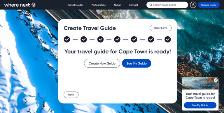 WhereNext guides users through a series of questions and uses AI to generate a travel guide tailored to their specific needs and preferences.
