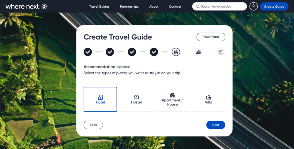 I designed the travel guide wizard, travel guide template, and design system in Figma and the designs were built by WhereNext’s developer.